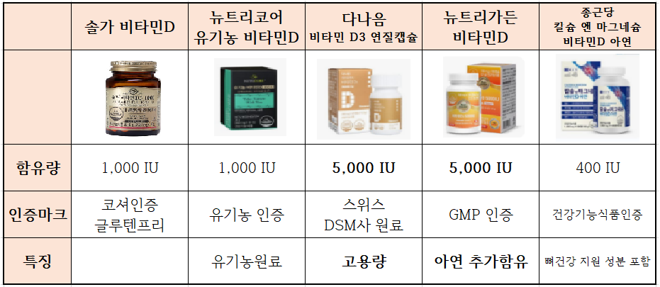 비타민 D 영양제 비교 요약